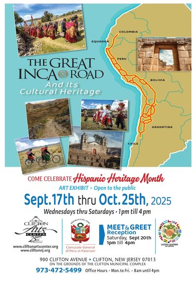 The Clifton Arts Center, in collaboration with the Consulate General of Peru in Paterson and the Latino Leaders of Clifton, proudly presents “The Great Inca Road and Its Cultural Heritage.” At the heart of this exhibition is “Qhapaq Ñan: The Great Inca Trail,” a photographic presentation by the Consulate General of Peru. This extraordinary road network—spanning Argentina, Bolivia, Chile, Colombia, Ecuador, and Peru—is one of humanity’s greatest engineering and cultural achievements. Designed to harmonize with the Andean landscape, it connected distant communities, facilitated trade, governance, and cultural exchange, and served as a lifeline of communication throughout the Inca Empire.